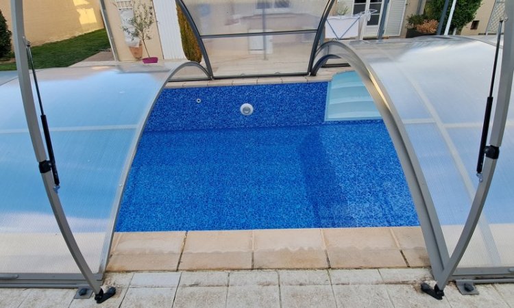 SOS Piscine > Rénovation liner piscine > Pose liner bleu carrara Rénovation d'un liner piscine secteur clermont ferrand sous abri Piscine de 8m x 4m avec fond en deux pentes Liner bleu carrara Liner posé à riom